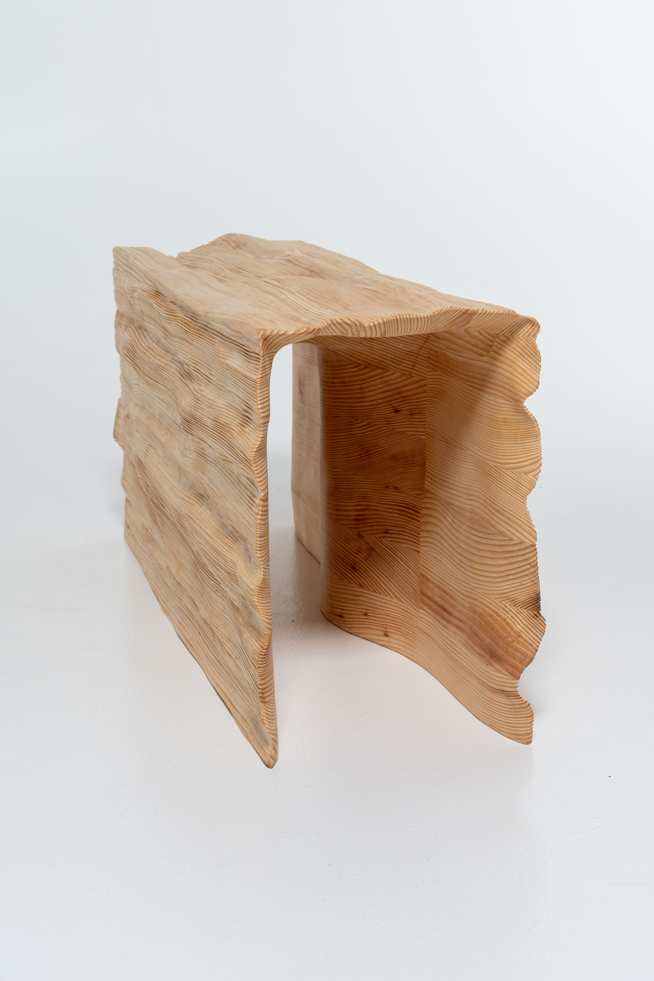 It was crafted from split wood planks and was assembled to create a seamless pleated texture. The bench is hollow, with a smooth inner surface that contrasts with its wavy outer surface. The edges are carved thinly, following the natural contours of the split wood.